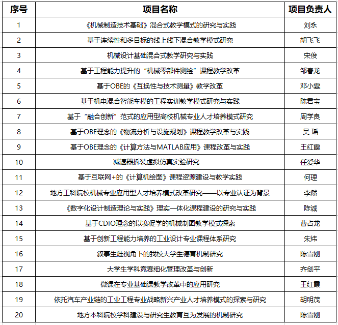 机械工程学院近几年校级教学研究与改革项目汇总