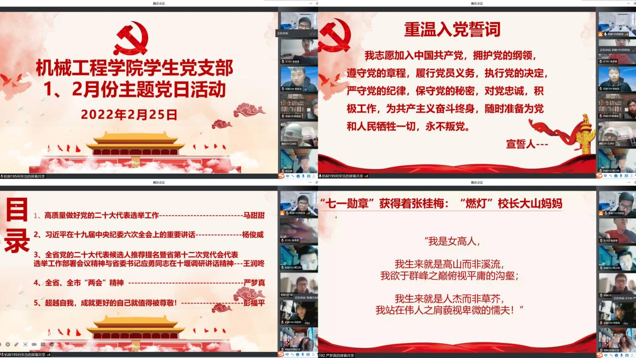 2月25日中午12:30,机械工程学院学生党支部在腾讯会议线上组织开展1、2月份主题党日活动。学院学生党员一支部书记何理、二支部书记张倩文以及全体学生党员、发展对象、入党积极分子参加学习。会议由学生党员何荣浩主持。