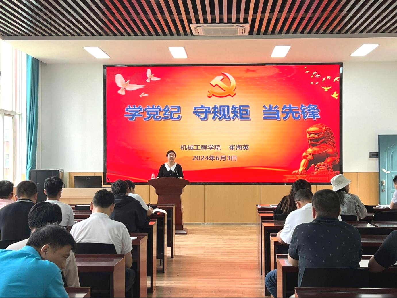 本网讯(文/图 钱坤)“全体党员同志要把握‘组织要求’一丝不苟抓学习、要掌握‘纪律规矩’一片赤诚跟党走、要掌握‘纪法戒尺’一如既往当先锋。”6月3日,机械工程学院分党委书记崔海英在学院会议室给学院全体师生党员讲授了党纪学习教育专题党课。