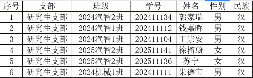 研究生支部委员会研究,学院党委会审议,拟确2024汽智2班郭家瑞等6名入党积极分子为2026年上半年发展对象,现予以公示,接受广大党员、群众监督。