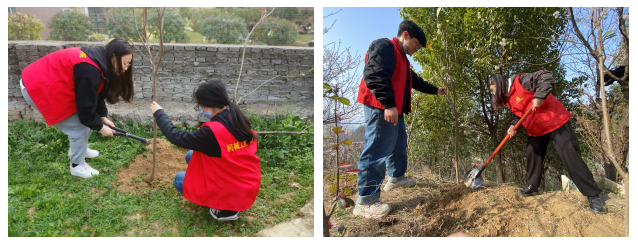 迎着初春的朝阳,学院师生带着水桶、铁锹等工具来到家和苑社区背后小山上,志愿者们在领取树苗之后便分成不同的小组前往植树区植树,植树过程中大家分工协作、互帮互助,挖坑、种植、填土、留念,体验植树带来的喜悦和快乐。