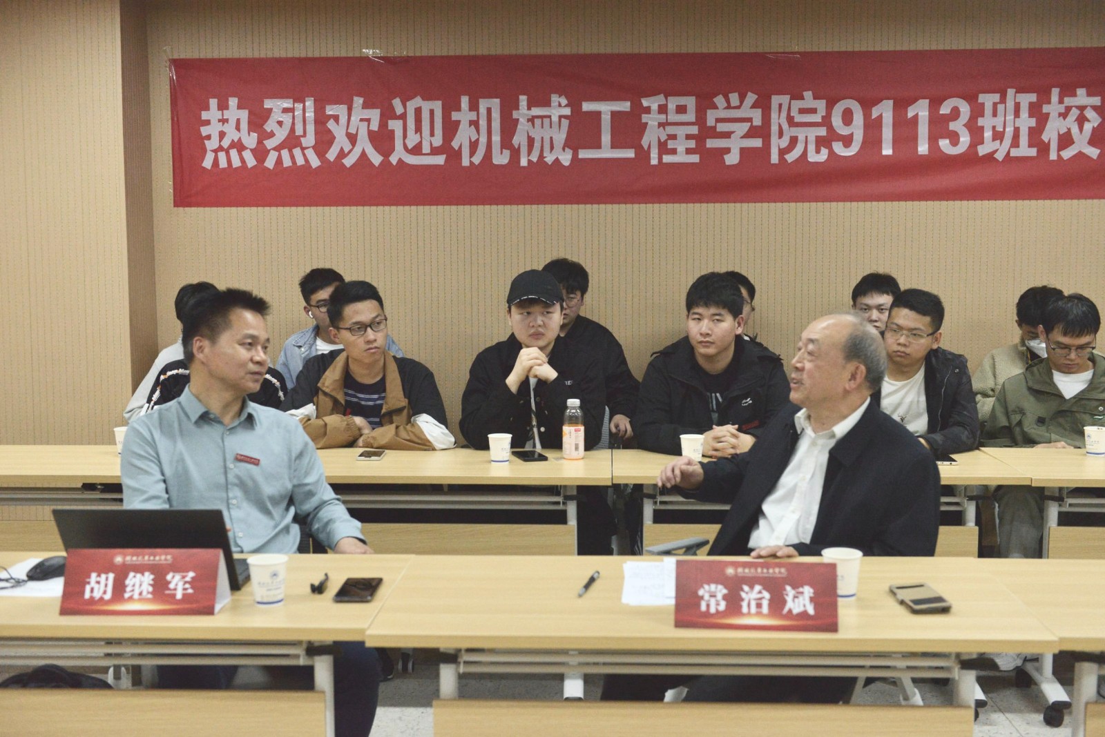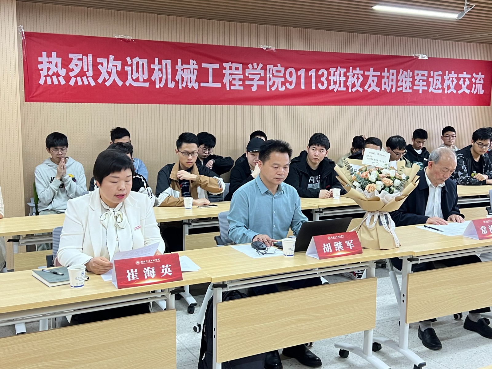 5月9日,风和日丽,风景如画。机械工程学院9113班校友胡继军返校交流大会在产教大楼二楼ZX-203报告厅举行。机械工程学院分党委书记崔海英、机械工程学院原机械工程系主任常治斌教授、辅导员及学生代表欢聚一堂,回忆青葱岁月,共襄学校发展。