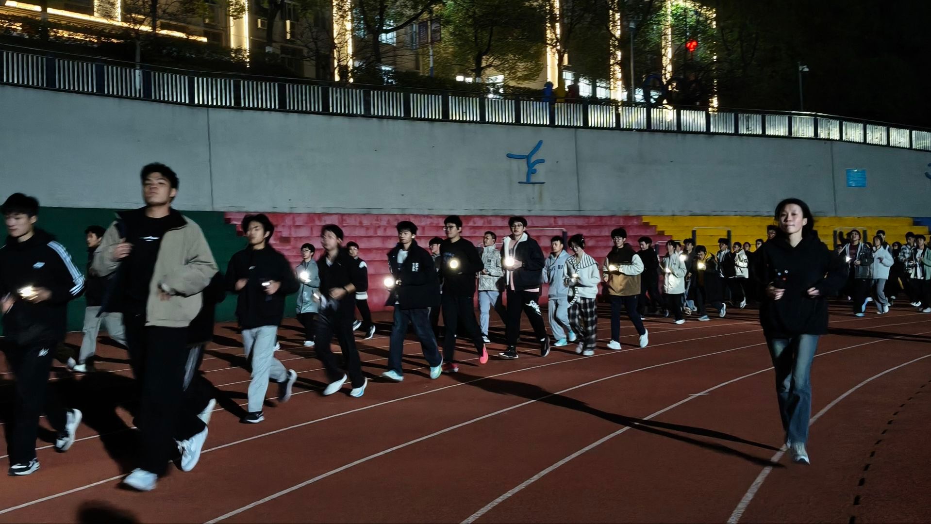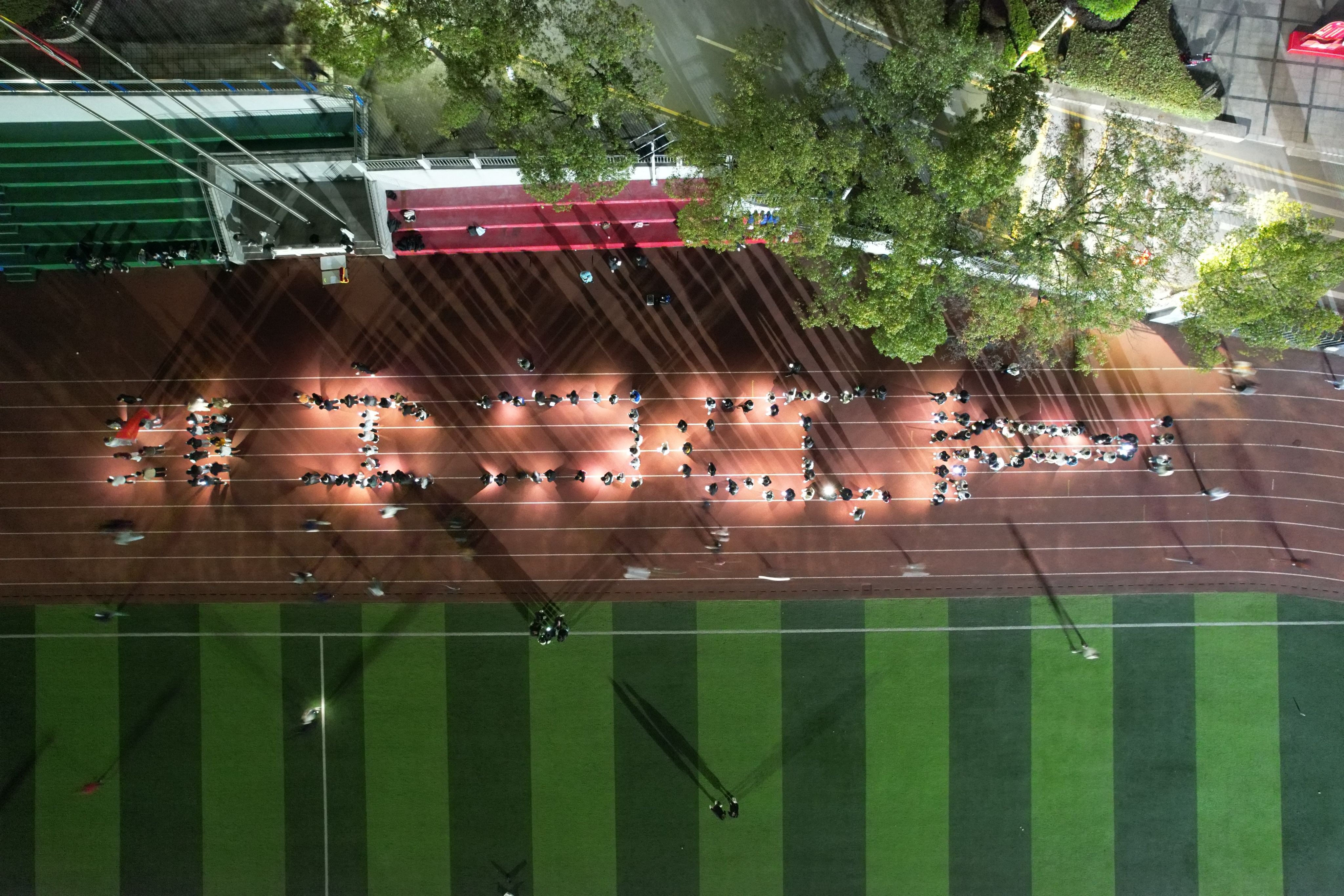 夜幕降临,荧光棒、手电筒在跑道上汇聚出“HUAT”字样,随着发令声响,荧光夜跑正式拉开帷幕。浩浩荡荡的荧光队伍如一条流光溢彩的河流,沿着既定路线奔腾向前。同学们欢声笑语,互相鼓励,手中的荧光棒在黑暗中划出一道道绚丽的光轨。