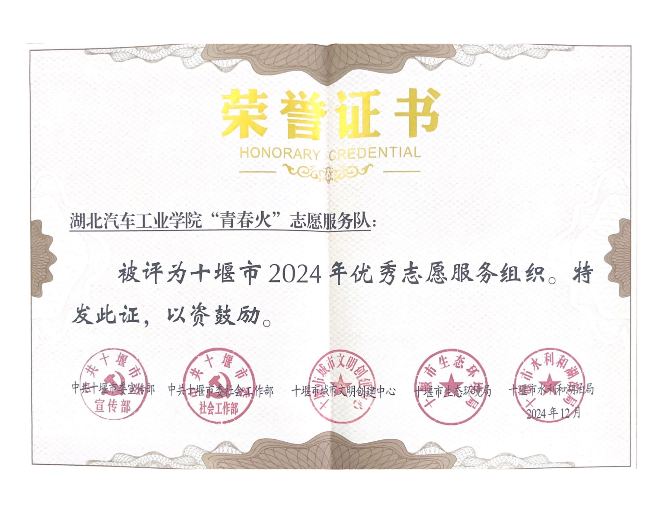 “青春火”志愿服务队于2006年成立,累计注册志愿者达3669人,志愿服务时数总计40581小时,人均志愿服务时数为11小时。该团队以志愿服务为基础,扎根校内、服务社会,依托“加油乡村夏令营”“七彩假期”“圆梦工程”等平台活动,近年来利用寒暑假前往竹溪、丹江口、淅川、郑州、重庆等地开展各类服务实践活动百余次,累计被各类媒体网站报道7000余篇,其中中青网报道150余篇,在学术刊物发表论文4篇。自2018年起,团队累计获得国家级、省市级奖项10余次。2024年,团队积极承担环境保护责任,与张湾区红卫街道动力新村社区、曾家村等建立长期合作关系,围绕垃圾分类、洁美社区、护河巡山等主题开展百余次主题宣讲和志愿服务活动,并沿南水北调中线工程开展生态环境保护与守水护水暑期社会实践,活动受到中青网、湖北教育信息网等多家媒体关注。
