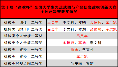 学子在全国2916人的制图大赛中,夺得7个奖项。吕灵丰、余恒顺、库洪凯获得机械类团体二等奖、3D打印二等奖;吕灵丰获得个人全能一等奖;高涵、余恒顺获得个人全能二等奖;高涵获得建模一等奖;库洪凯获得建模二等奖;司机社