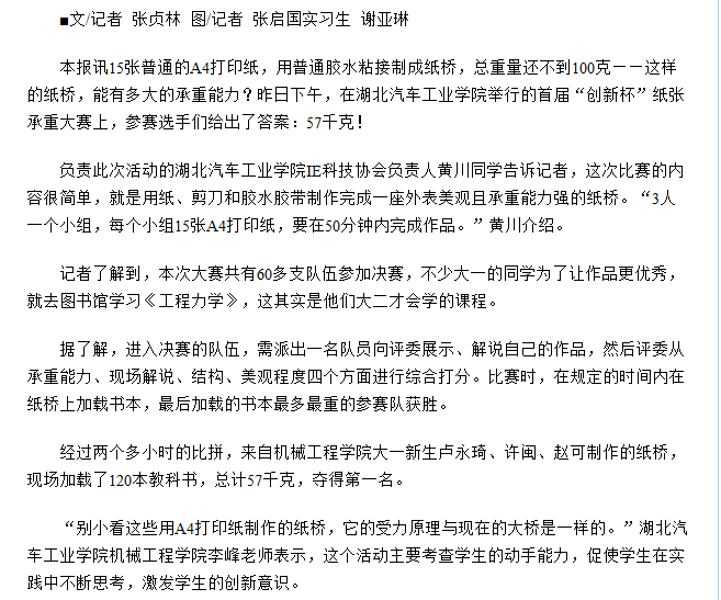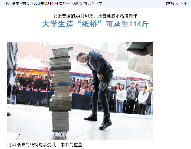 【十堰晚报】汽院大学生造“纸桥”可承重114斤
