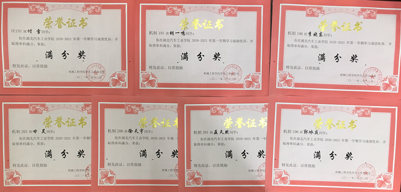 在2020—2021学年第一学期期末考试中,机械工程学院机制191班胡一鸣等7位同学获得高数单科满分。3月30日下午,机械工程学院为学霸们颁发奖状、笔记本、保温杯等奖品向其表示祝贺,并号召全院学生向优秀看齐,营造浓厚的比争赶超学习氛围。