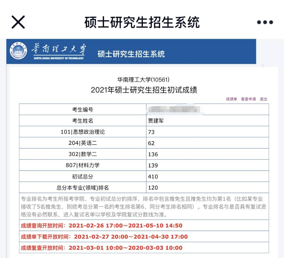 机械工程学院机械设计制造及其自动化专业的贾建军,收获了一份令他惊喜的好成绩:考研初试总分410分,复试表现突出,成功被华南理工大学机械与汽车工程学院机械工程专业录取!