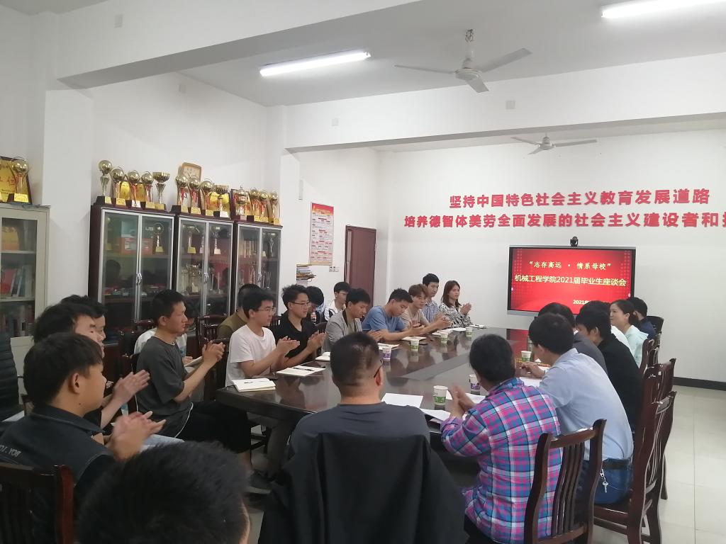 为进一步了解毕业生思想动态,增进师生感情,强化学生爱校荣院情怀,5月25日下午,机械工程学院以“志存高远·情系母校”为主题组织召开2021届毕业生座谈会。学院班子成员、部分专业负责人、老师代表、辅导员以及18名毕业生代表参加了此次座谈会。会议由分党委副书记周丹主持。