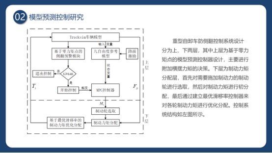 付众铖从防侧翻模型预测控制及相关论文写作经历做了详尽的报告。首先,介绍了课题研究意义及现状。指出重型自卸车中心高,轮距小,作业环境复杂,易发生侧翻事故,因此防侧翻研究在保障交通运输安全中发挥着重要的作用;其次,他介绍了自己对模型预测控制的研究,主要分为预测模型,滚动优化和反馈矫正三方面;