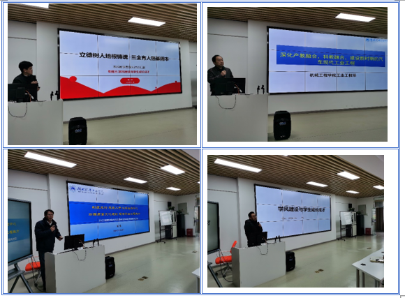汇报会上,学院各系部聚焦主题,结合工作实际依次发言。副院长王宸代表院办围绕“全面落实立德树人根本任务,坚决打赢新一轮本科审核评估攻坚战”这一主题开展汇报,他强调要加强理论学习、制度建设、专业思政和课程思政建设,为立德树人提供坚强保障。工程图学部曹占龙副教授做题为“提升教育教学服务水平,培育优质本科人才”的汇报,他指出,工程图学部要传承和发扬老一辈教师们“认真仔细、精益求精的工作作风”,作为教学型教师,无论任何时代都要认真上好每一堂课,认真批改每一份作业,用自己的行为示范影响学生、感染学生,为学生树立好榜样。机电工程系主任袁海兵教授围绕“产教融合,打造机械设计制造及其自动化国家一流应用型专业”开展汇报,重点介绍了机电工程系在产教融合和专业平台建设方面的工作思路和成效。学院分团委书记钱坤围绕“立德树人培根铸魂,‘三全育人’强基固本”主题展开汇报,提出学院要构筑全方位育人格局,强化学生教育数字信息化支撑,发挥制度育人、协作育人、心理育人功效。