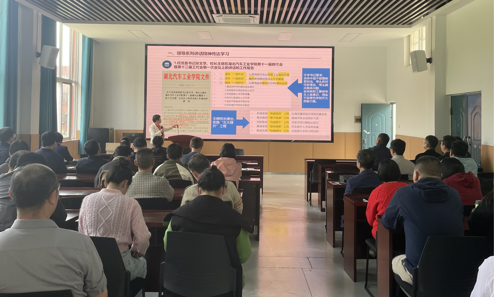 随后,崔海英传达学习了校领导在2024年学校高质量发展目标管理工作部署会、2024年平安校园建设工作大会、2023年新晋高级职称教师聘任仪式等系列讲话精神,各分管院领导对学院2024年目标考核任务书指标进行了解读,并对近期重点工作进行了谋划和部署。