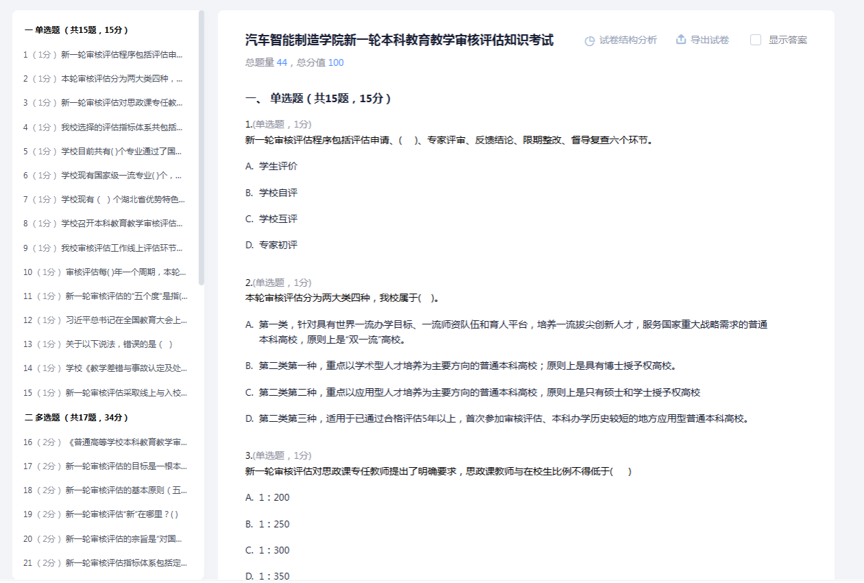 本次考试依托“学习通”平台在线开展,共设置44道题目,涵盖审核评估核心知识、学校发展历程、学院专业特色与建设成果等内容,全方位考察师生对评估工作的认知深度。考试前,学院通过专题培训、资料汇编发放等形式,引导师生系统学习评估相关文件,营造“人人关心评估、人人参与评估”的浓厚氛围。
