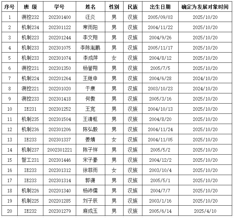 根据《中国共产党发展党员工作细则》(中办发〔2014〕33号)文件精神,按照学校党员发展工作的具体要求,现将司机社 2025年11月拟发展学生预备党员预审情况予以公示,具体名单如下: