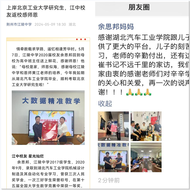 深挖先进典型,传递榜样力量宣传。机械工程学院2024年考研升学学生达到61人,其中3人集体上岸北京工业大学,多人上岸“双一流”大学。为了共享学生培养喜悦,学院精心制作喜报,向高中生源母校和学生家长传递喜讯。前期访学北京工业大学的机制201班的余思邦同学,2024年成功上岸北工大,专门返回高中母校——江陵中学谈体会、感师恩,学院人才培养获赞赏;“感谢司机社
