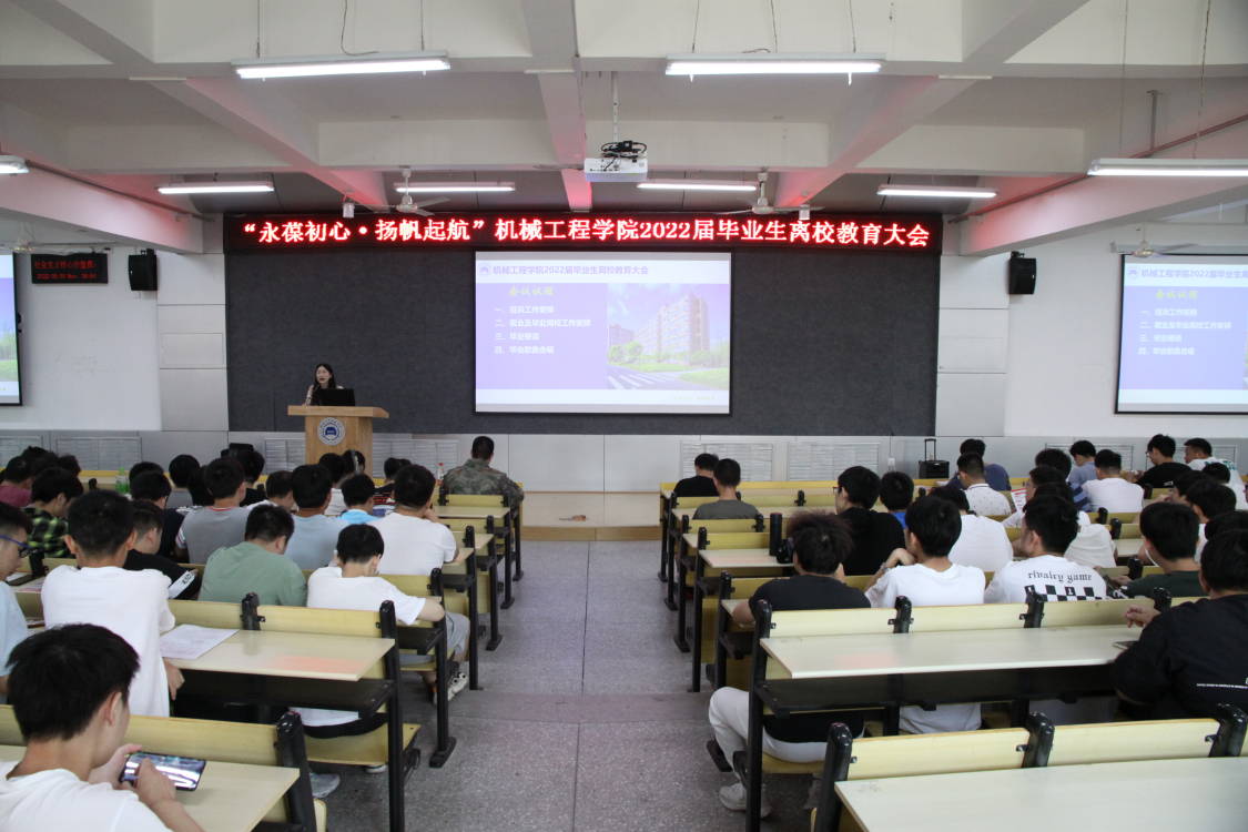 又是一年毕业季,正是扬帆远航时。为扎实做好2022届毕业生离校前的各项工作,5月30日上午,机械工程学院在6113教室组织召开2022届毕业生离校教育大会。此次会议以“永葆初心、扬帆起航”为主题,通过“线上+线下”相结合的方式,学院分党委书记宫爱红、校国防教育中心主任张华、学生工作办公室全体辅导员老师参加会议,会议由辅导员张倩文主持。