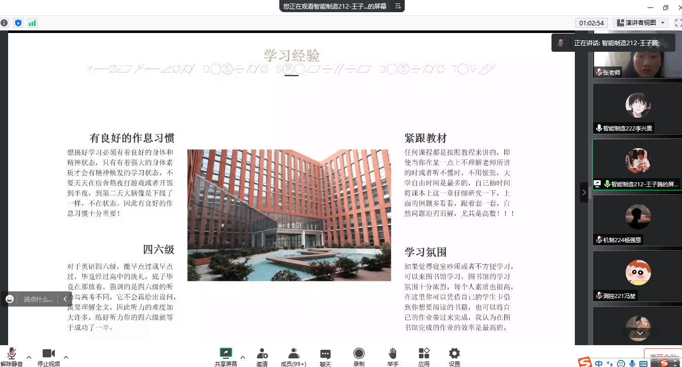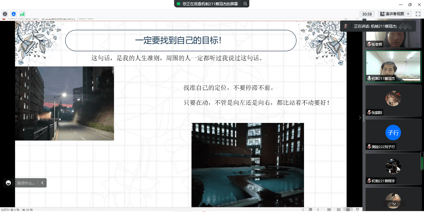 为了让新生更好的迎接大学学习生活,机械工程学院于2022年9月18日下午两点在腾讯会议开展了以“榜样的力量”为主题的新老生学习经验交流会。机械工程学院张倩文老师、测控202吕碧、机制211蔡冠杰、智能制造212王子腾以及已经毕业的优秀学长学姐为新生们分享他们的学习经验和新学期寄语。