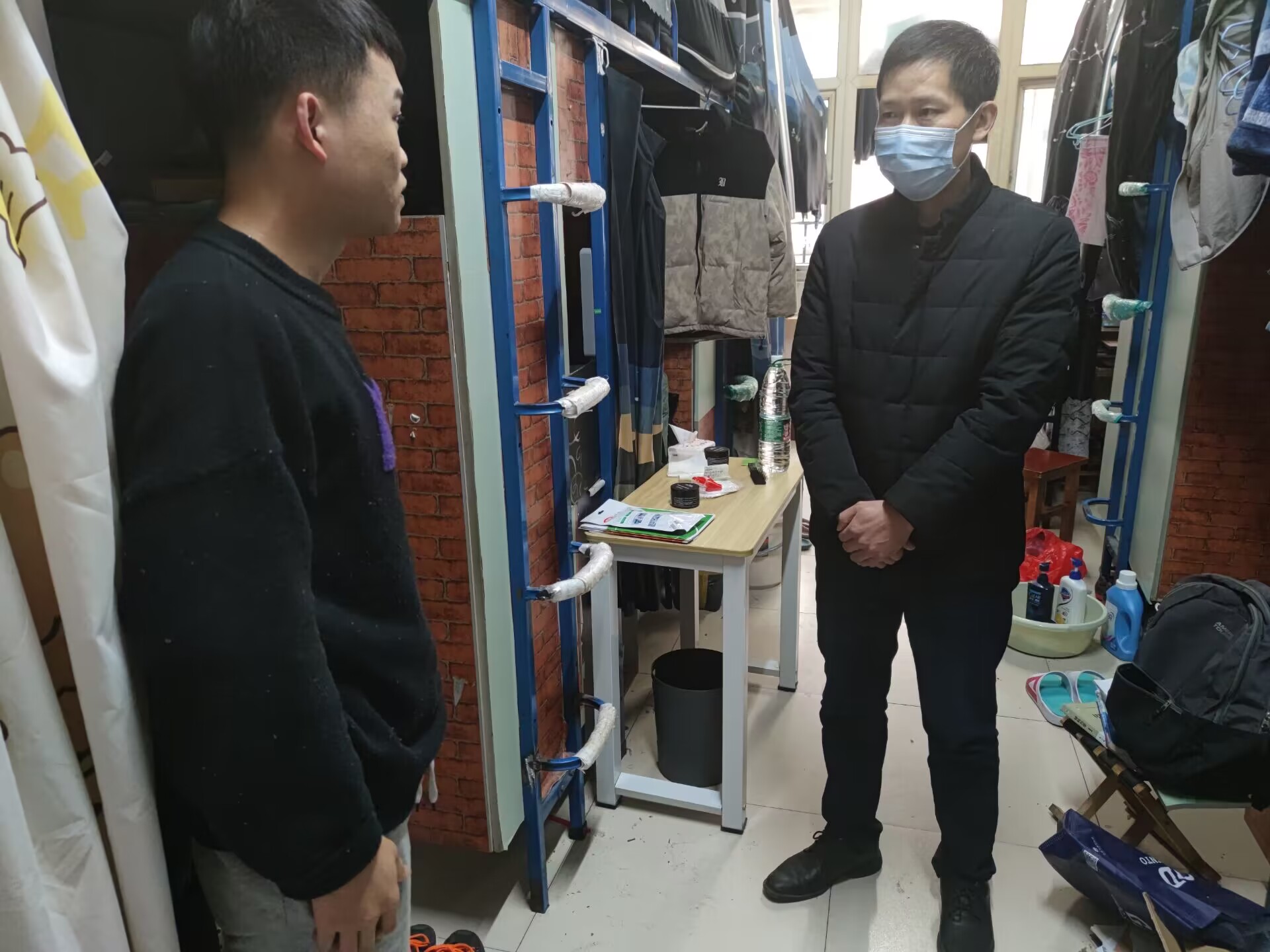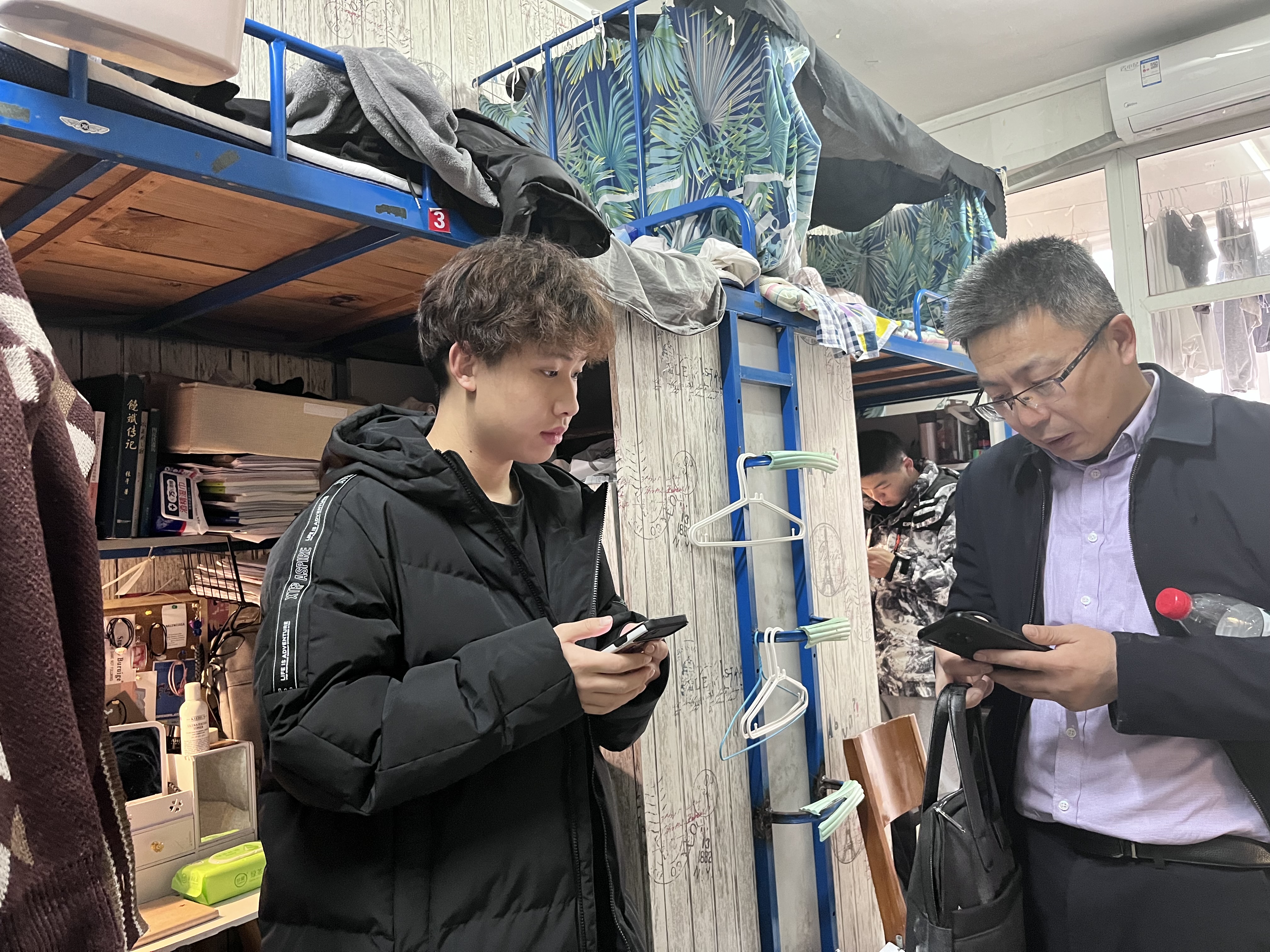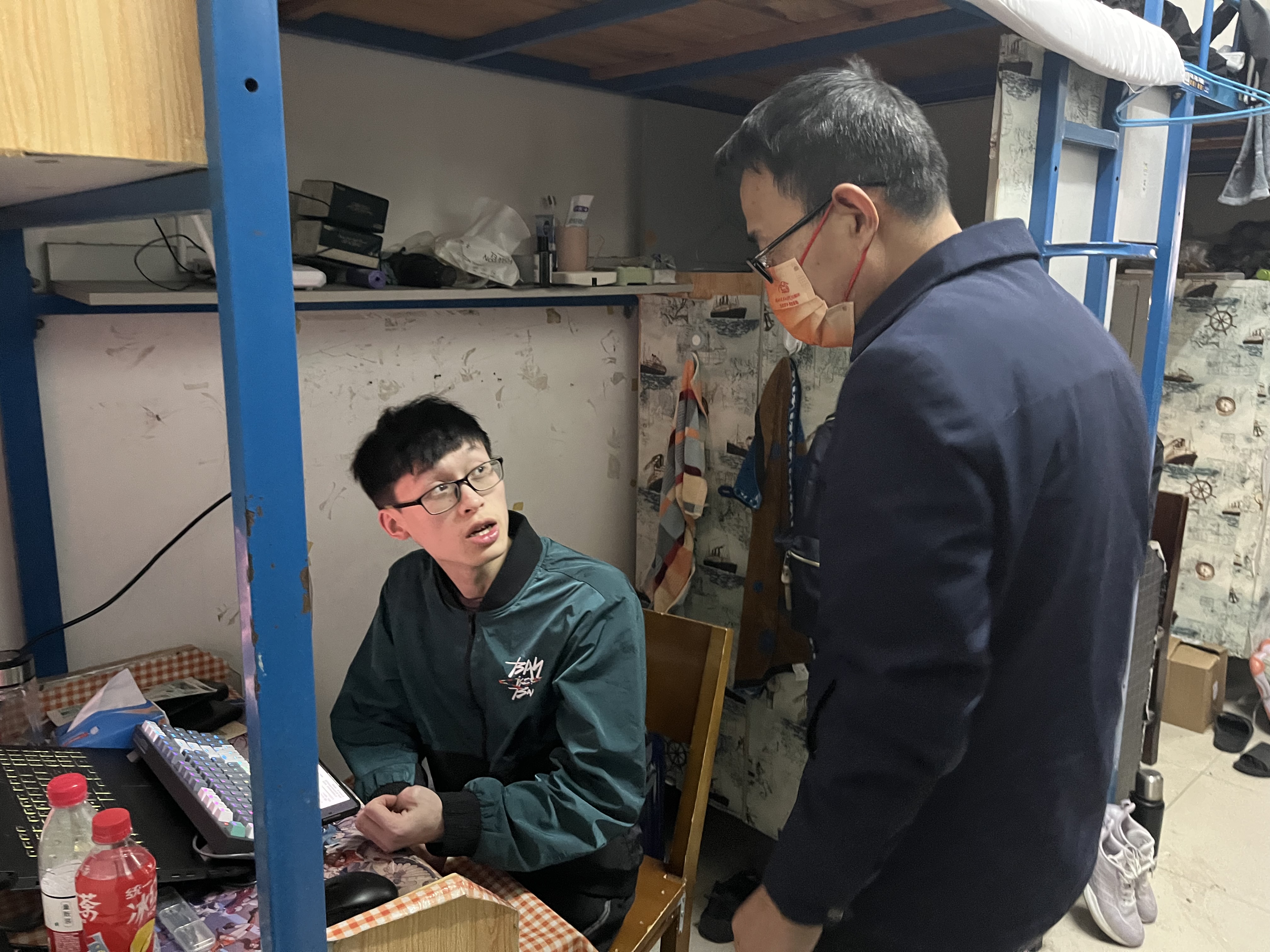 走访过程中,学院领导与同学们进行了近距离、亲切的交流,详细询问了大家的学习进展、生活状况以及临近考试的复习安排和心理状态,叮嘱同学们遇到困难或困惑时,可以及时向老师们反馈,并要求学生要提高安全意识,注意人身和财产安全。同时学院领导了解到各自结对联系学生积极准备考试,甚是欣慰,鼓励他们要继续保持,学会自律自主学习,注意劳逸结合,为自己的人生做好规划。领导老师们特别关心同学们的学习情况,勉励同学们要端正学习态度,认真对待每一门课程,养成良好的学习习惯,掌握扎实的专业知识,为今后走向社会打下坚实基础。走访过程中,师生脉脉温情和阵阵笑声在寝室中流淌。