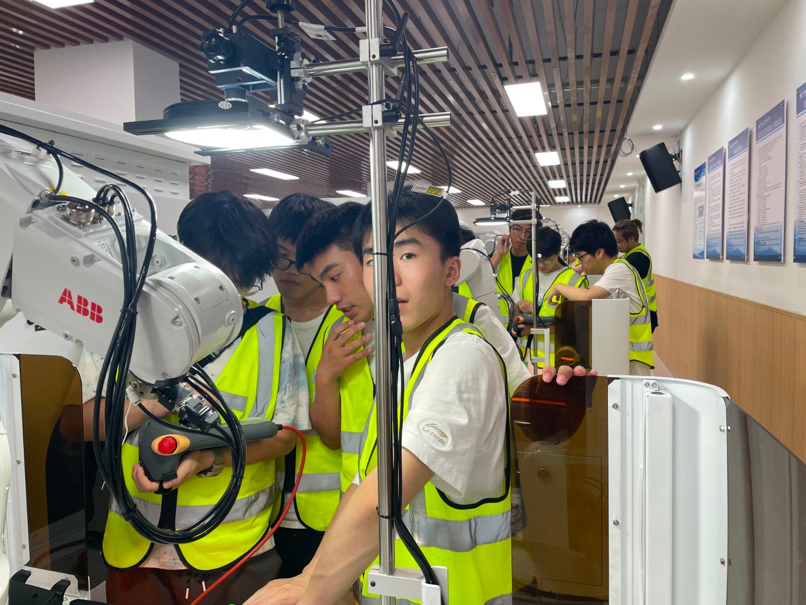 交流活动在产教大楼智造中心二楼工业机器人实验室举行,机械工程学院副院长陈君宝发表了热情洋溢的欢迎致辞,对学校的整体情况、研究生招生政策、机器人操作技巧及安全操作规程进行了详尽的介绍。上海海洋大学的沈洁老师巧妙地将学生们分组,并在双方教师的共同指导下,引导学生们进行了工业机器人实操训练。通过这次亲身体验的训练,学生们加深了对机器人技术的理解和认识。通过亲手操作,他们能够将理论知识与实际应用相结合,从而更加全面地掌握工业机器人技术。